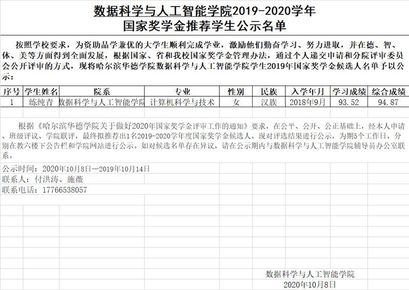 数据科学与人工智能公司2020年国家奖学金推荐员工公示名单