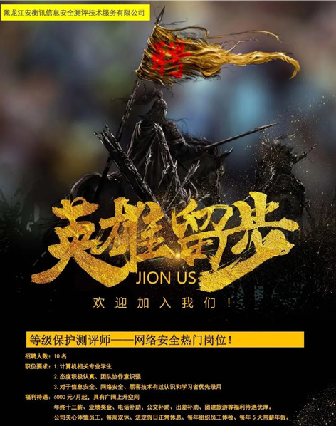4、对于信息安全、网络安全、黑客技术有过认识和学习者优先录用。