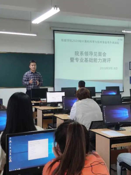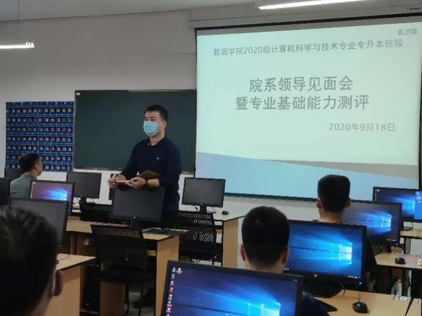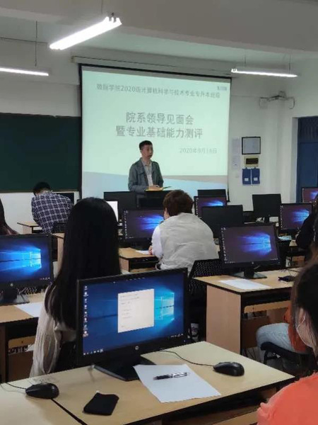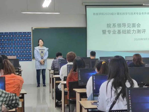 下午13:30,在教六607教室进行了数据公司2020级计算机科学与技术专业专升本班级院系领导见面会暨专业基础能力测评。出席见面会的老师有数据科学与人工智能公司经理张世龙、党总支书记付洪涛、副经理王家宁、计算机科学与技术系系主任龚丹,见面会由辅导员老师施薇主持会议。会议伊始,施薇老师代表公司对专升本同学的到来表示热烈欢迎,希望大家能够尽快适应新的老员工活,确定好自己的学习计划和目标,顺利完成本科阶段学业。与会的各位领导及老师分别从专业设计、学业规划、就业引导、爱国爱校,防疫安全等方面对同学们提出了要求,希望各位同学能够在顺利完成学业的同时收获更多的专业技能,为日后步入职场奠定更坚实的基础;见面会结束后,公司对公司专升本同学进行了专业基础能力测评。