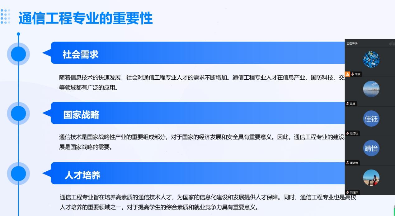 会上,专家从一流专业建设的背景与任务出发,分析了我国高等教育的发展现状与挑战,并结合自身研究实例深入剖析了科研创新的内涵、特点和发展趋势。专家强调,专业教师应具备敏锐的洞察力和勇于尝试的精神,不断探索新的研究方向和方法。专家还分析了当前通信工程技术的发展趋势和市场需求,强调了专业建设与行业发展紧密结合的重要性。详细介绍了通信工程领域的最新研究成果和技术应用,包括5G通信技术、物联网、大数据等前沿技术。用生动的语言和丰富的案例,深入浅出地讲解了这些技术的原理、应用场景以及未来发展方向。
