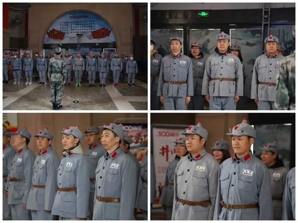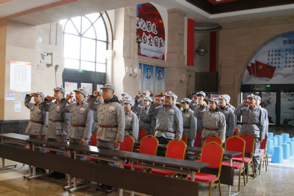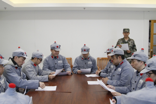 开营前,在带队教官的指挥和组织下,换抗联战士军装,学革命军人站姿,为开营做准备。