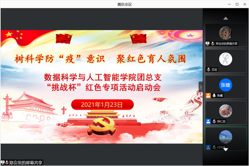 为深入落实校团委下发的《关于举办第十七届“挑战杯”红色专项活动校园选拔赛的通知》文件精神,在喜迎建党100周年之际,发挥红色文化育人功效和重要意义,1月23日,数据科学与人工智能团总支在“云端”召开主题为“树科学防‘疫’意识,聚红色育人氛围”的“挑战杯”红色专项活动启动会。数据公司党总支书记付洪涛、团总支负责人张健、全体辅导员出席会议,公司员工会全体成员、各团支部负责人参加会议。会议由张健主持。