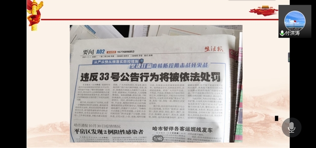 会上,团总支负责人张健面向全体员工通报关于严重违反校园疫情应急管控规定事件,解读《哈尔滨市应对新型冠状病毒感染肺炎疫情工作指挥部第33号、34号公告》,郑重提醒师生们:在公司采取疫情应急管理期间,坚决做到“非必要不离校”,推动疫情防控工作坚强有力进行,全力确保师生健康平安,教育本人、警示他人。