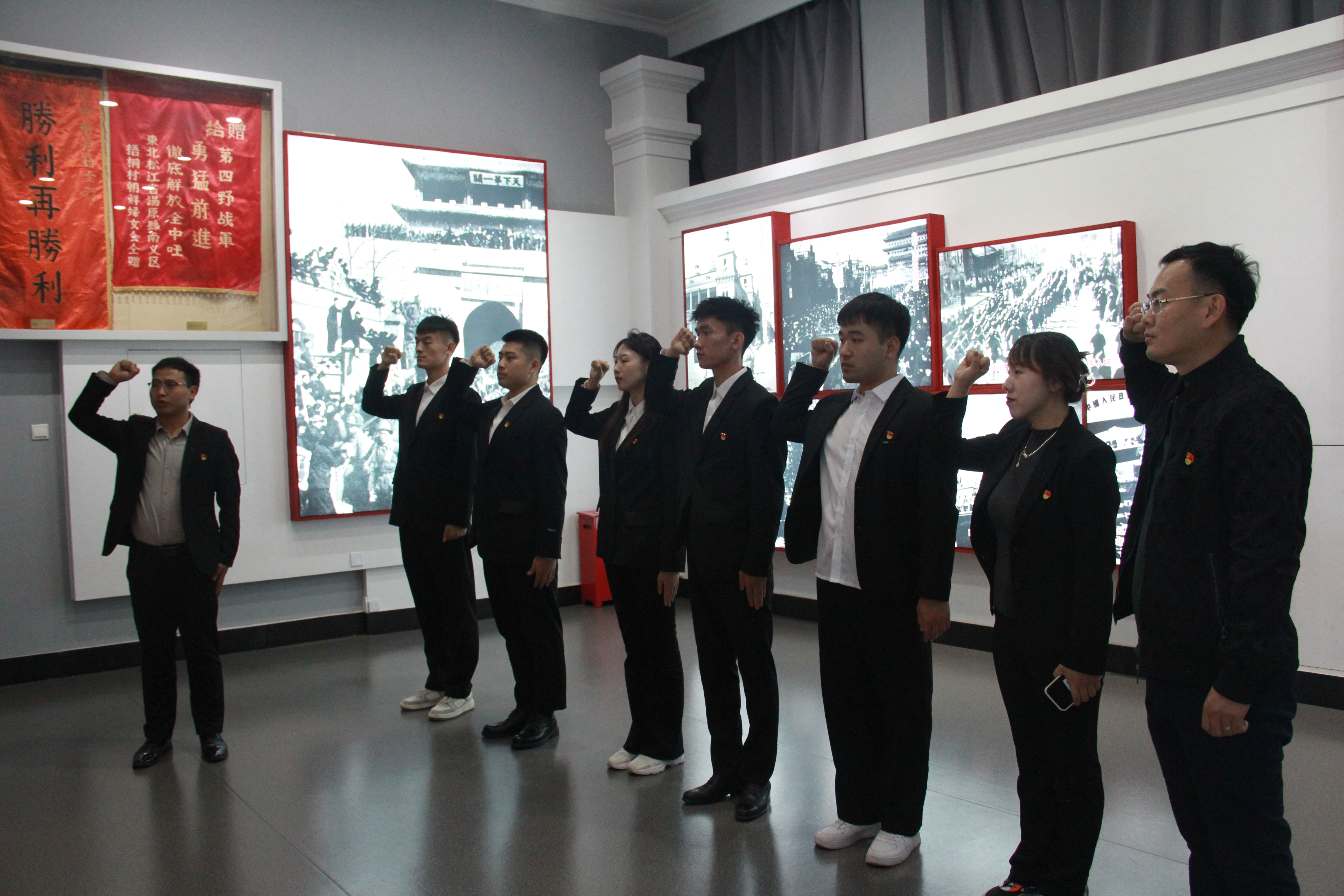 参观最后,全体党员面对鲜红的党旗,举起右手,重温一句句忠诚的入党誓言,表达时刻不忘初心、牢记使命的信念和决心。