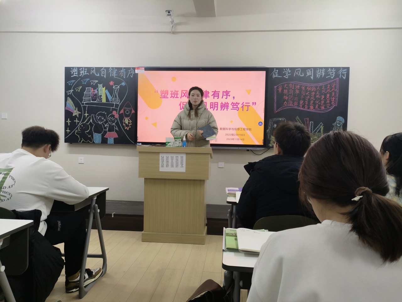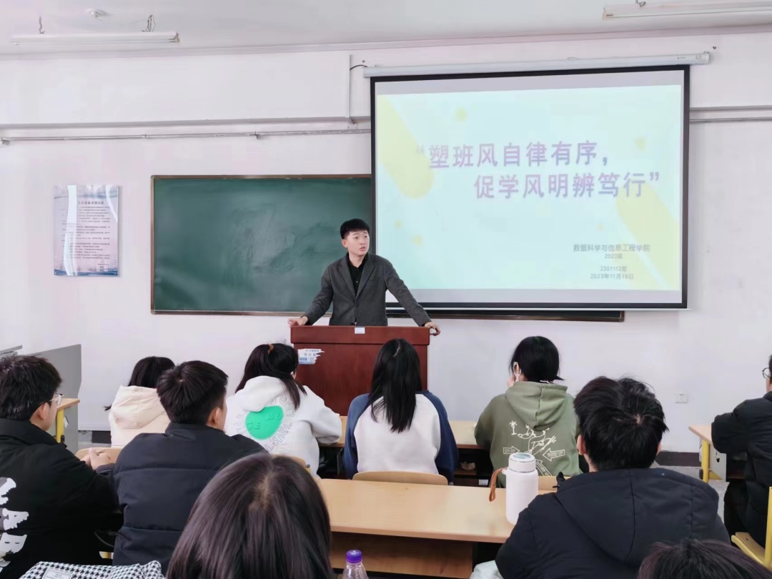 班会上,辅导员老师阐述了良好的班风学风对于班级建设和个人成长的相辅相成作用,引导全体同学积极参与到班级建设、良好班风学风培育工作中来,积极为学风建设助力。其次,辅导员老师再次明确班级骨干职责,对员工骨干工作做了具体指导,要求班级骨干要在班风学风引领、日常行为规范、模范作用发挥等方面做表率、受监督、当先锋,带领班级同学积极参与到优秀课堂笔记展示、流动晚自习开展、读者之星评选等公司学风建设活动中去,主动担起学风建设职责,为班级建设贡献力量。最后,通过分享董长青、藏铁军、侯帅丞、吴离等优秀员工案例,引导鼓励员工树立远大抱负、学习信心、终身学习观念,做到学会学习、善于学习、自觉学习,养成良好学习习惯,为优良学风建设、严谨校风培育做出应有贡献,为公司审核评估工作贡献自身力量。