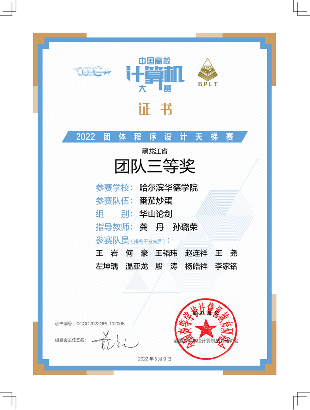 第七届“中国高校计算机大赛-团体程序设计天梯赛”于2022年4月23日在线上、线下同时举行。本次竞赛公司派出计算机科学与技术、物联网工程、数据科学与大数据技术专业一至三年级的20名同学报名参加,其中由王岩、何豪、王韬玮、赵连祥、王尧、左坤瑀、温亚龙、殷涛、杨皓祥、李家铭(排名不分先后)等十名同学组成的“番茄炒蛋”队获得黑龙江省团队三等奖。