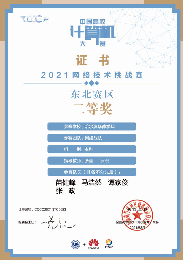 “中国高校计算机大赛-网络技术挑战赛” 于2021年3月-2021年9月完成报名、资格赛、选拔赛和总决赛,本次比赛公司组织10支团队参加比赛,经过资格赛和选拔赛,共获得东北区二等奖1项,东北区三等奖1项。