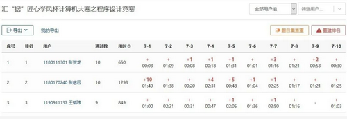 初赛、复赛中脱颖而出78名参赛选手。经过决赛3个小时的激烈角逐,来自2018级计算机科学与技术专业的张贺龙同学在比赛半程率先AK(解出全部题目),获得冠军;2018级数据科学与大数据专业张慈远同学在比赛结束前顺利完成AK,取得亚军;2019级计算机科学与技术专业王韬伟同学初生牛犊不怕虎,冲破高年级学长的包围,以解出9题的成绩取得季军。