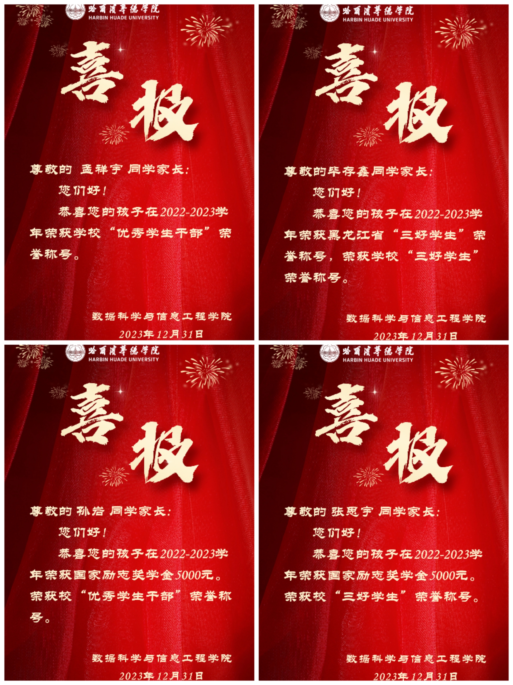 为表彰勉励优秀学子,夯实学风建设工作成果,构建“家校共育”育人模式,在2024年新年之际,1946伟德国际源自英国统一制作喜报,为荣获“国家奖学金”、“国励奖学金”、“省级三好员工”、“公司优秀员工干部”等荣誉称号员工家长累计线上发出“喜报”200余份,与家长共享员工的成绩与收获。