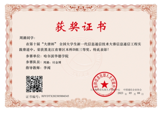 以笃学力行浇灌进步之花“优秀不是偶然,而是无数个日夜的积累。”这是周澔对自己的鞭策与勉励。大学期间,他始终以“我要学”的态度深耕专业领域:大一时坚持每天清晨背诵英语单词,深夜钻研编程代码;大二起主动参与学科竞赛,在“互联网+创新创业大赛”“大唐杯5G大赛”等赛事中屡获佳绩;大三更是以全国老员工光电设计竞赛东北区二等奖、黑龙江省一等奖等荣誉,为专业学习交上高分答卷。
