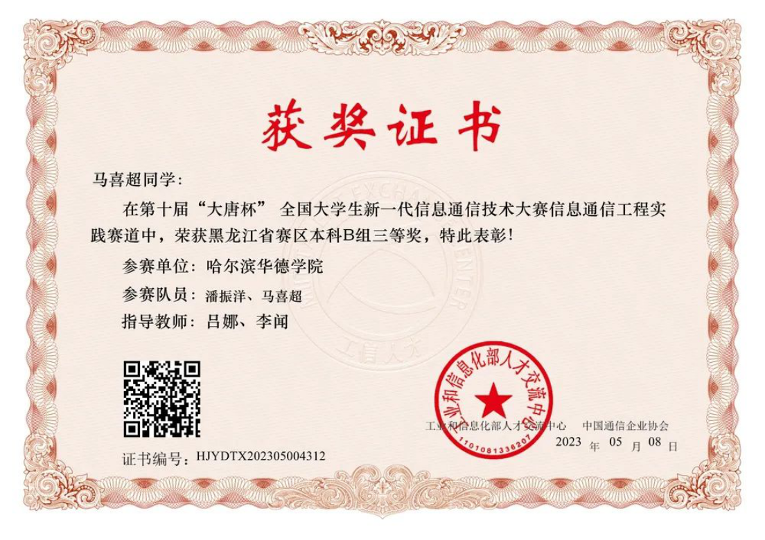 △ 马喜超在第十届“大唐杯”全国老员工新一代信息通信技术大赛中荣获黑龙江赛区三等奖