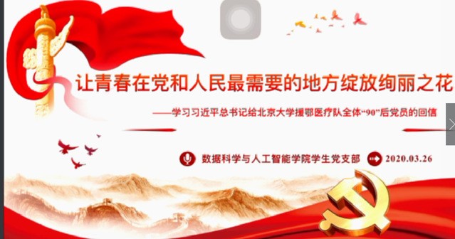 活动中,党支部书记苏军领学了“习近平总书记给北京大学援鄂医疗队全体90后党员回信”,勉励全体党员向抗疫一线的党员学习,向优秀党员看齐!与会党员共同观看了【战“疫”青春——不负韶华的抗疫“90后”】宣传片,兰雪、白新乐等8位同志从“90后”的青春自信、责任担当、理想信念方面做了发言,表达自己爱国奋斗之情,和向优秀党员学习、努力为疫情防控工作做贡献的决心。