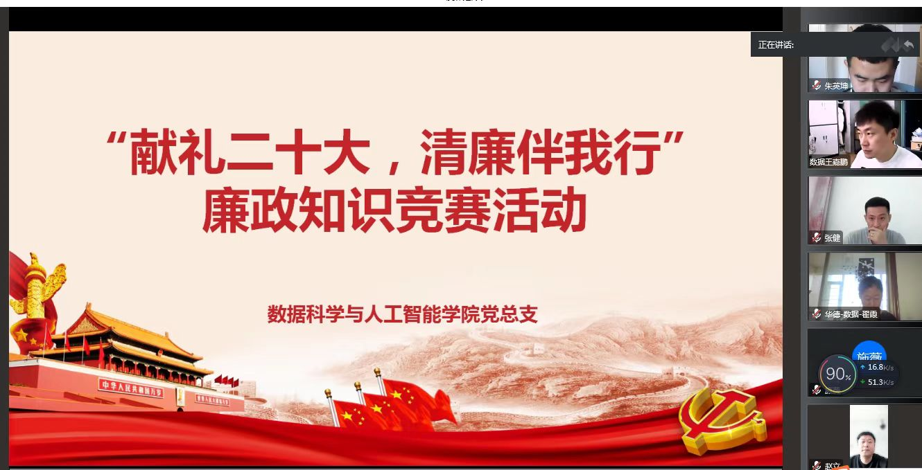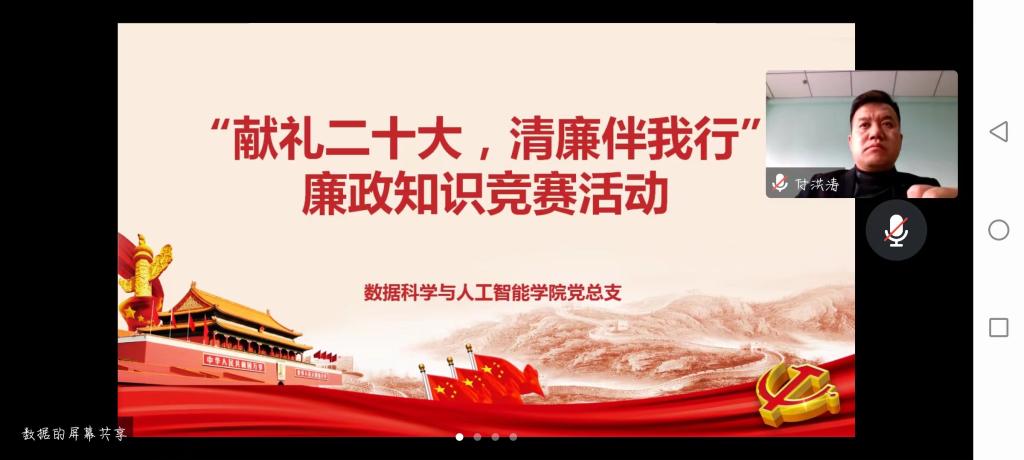 为深入学习贯彻党的二十大精神、全面推进从严治党及党风廉政建设,进一步推进华德廉洁建设走深走实,使广大党员干部进一步增强党性意识、法纪意识、合规意识、廉洁意识,营造“守党纪,正党风”的良好氛围,11月15日,数据公司党总支采取腾讯会议线上组织开展“献礼二十大,清廉伴我行”廉政知识竞赛活动,公司党总支书记付洪涛、经理张世龙、副经理王家宁出席,共24名教师党员参与比赛。