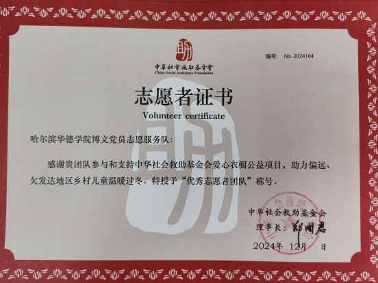 自2016年“博文”党员志愿服务队被中国青少年发展基金会“爱心衣橱”黑龙江站授权为唯一一支在校老员工志愿服务队至今,服务队始终坚持以高度的热情与责任感参与爱心衣橱公益项目,助力偏远、欠发达地区乡村儿童温暖过冬。服务队多次奔赴大庆市杜蒙县烟筒屯镇中心公司、绥化市兰西县红光中学小学部和依兰县江湾中学等地,亲手为孩子们穿上崭新的羽绒服、冲锋衣,看着孩子们脸上洋溢的笑容,志愿者们深感付出的一切都意义非凡。