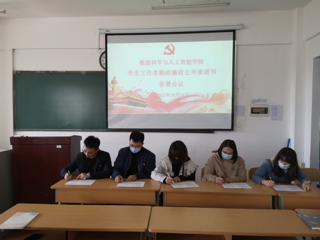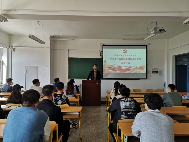 为深入学习习近平新时代中国特色社会主义思想,落实习近平总书记关于勤政廉政工作的重要指示精神,更好推进公司员工工作,数据科学与人工智能公司党总支于10月14日组织全体员工工作者在教五504室召开公司全体员工工作者勤政廉政公开承诺书签署会议。公司全体员工工作者,党员、员工干部和普通同学代表参加,公司党总支书记付洪涛莅临,会议由公司党总支组织委员、员工第一党支部书记苏军主持。