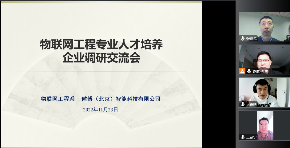 为进一步做好人才培养方案修订,加强校企合作力度,提升教学质量,11月23日遨博(北京)智能科技有限公司教育事业部销售总监孔博、数据科学与人工智能公司经理张世龙、副经理王家宁、物联网工程系主任王嘉鹏参加了物联网工程专业人才培养企业调研线上交流会。会议由物联网工程系主任王嘉鹏主持。