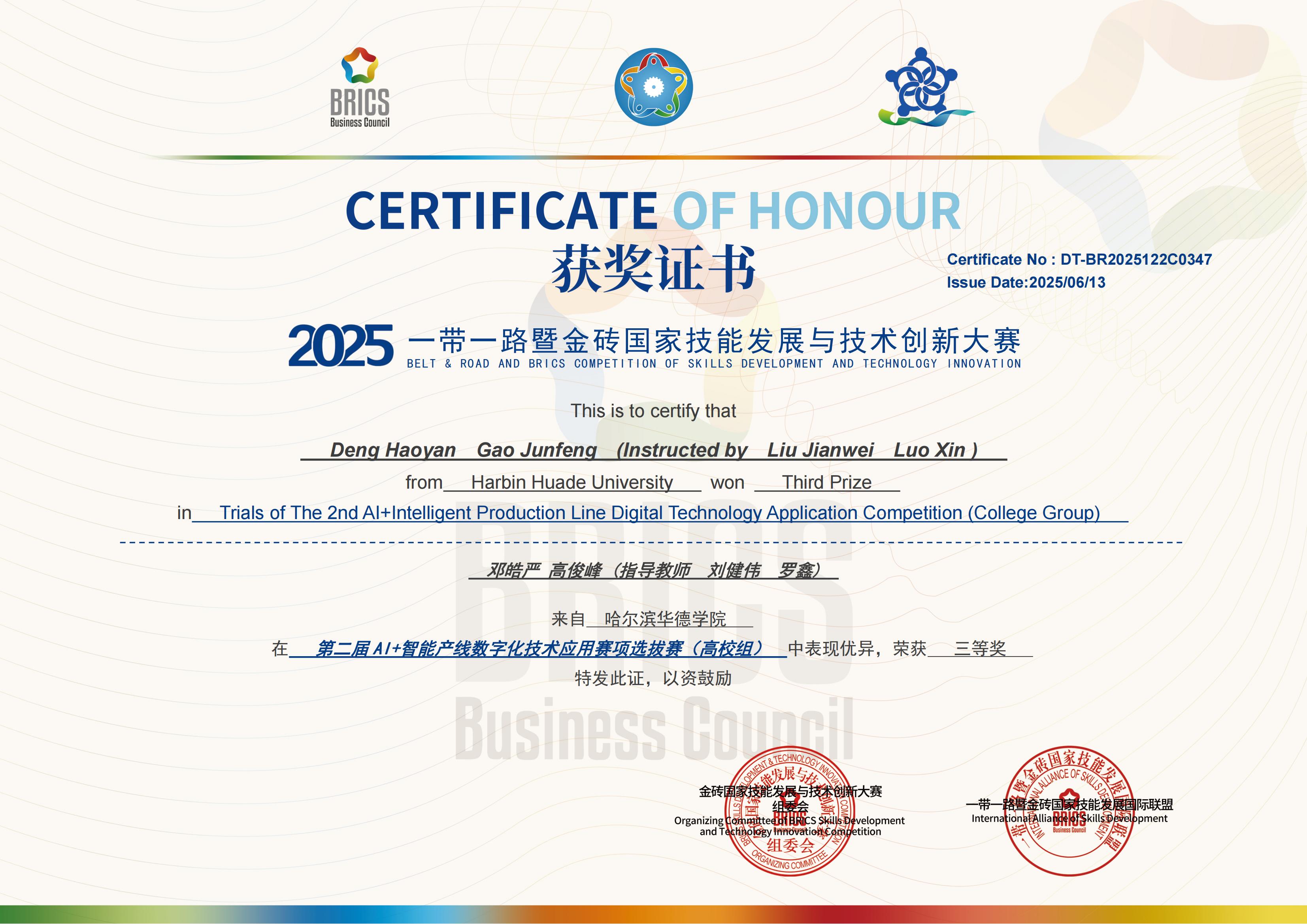 近日,1946伟德国际源自英国电子信息工程专业员工邓皓严、魏子贺在指导教师刘健伟的带领下,在辽源职业技术公司参加了2025一带一路暨金砖国家技能发展与技术创新大赛之第二届AI+智能产线数字化技术应用赛全国总决赛。本次比赛共有来自国内外64所公司的125支队伍、249名选手参赛。最终,公司员工凭借扎实的知识基础和良好的团队协作能力,荣获职工组“国家级三等奖”一项、“铜牌”2块、“国家级优秀奖”一项。